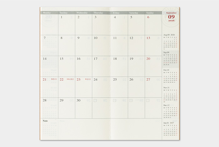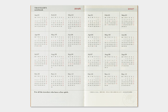 This is a refill for the Traveler’s Notebook regular size. This monthly planner is a 2026 agenda and predated for the months December 2025 — January 2027. Each double-page in this free planner is worth an entire month, with 31 empty fields plus extra space, and thus provides a quick overview of all your upcoming appointments. When you complete this monthly planner, you will have 14 months worth of your memories inscribed. The MD paper of this notebook, gives you nothing less than great feeling when writing. The 2026 agenda includes a bonus diary guide and customizing stickers.