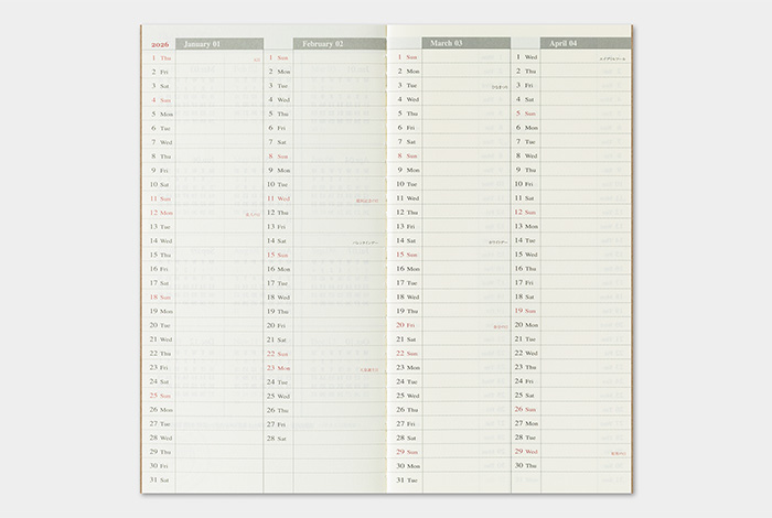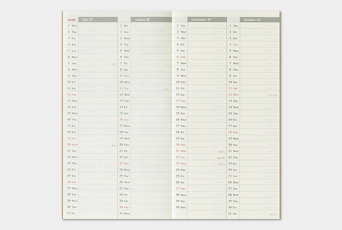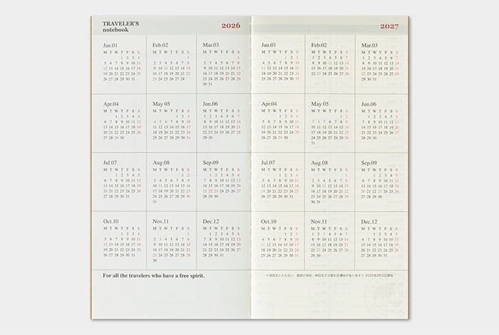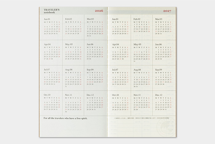This is a refill for the Traveler’s Notebook regular size. This weekly planner with horizontal layout is predated for the year 2026 and consists of two individual notebooks, the first one is predated for the months January to June, the second one from July to December.