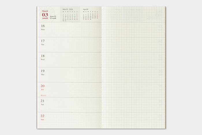 On the left side, you have a section where you can write your plans and appointments, and on the right side, you have the memo section with grid for notes and drawings. Each double-page in this planner is worth one week. The planner provides enough space for 6 months worth of your memories and appointments. The MD paper of this notebook, gives you nothing less than great feeling when writing. The 2026 agenda includes a bonus diary guide and customizing stickers.